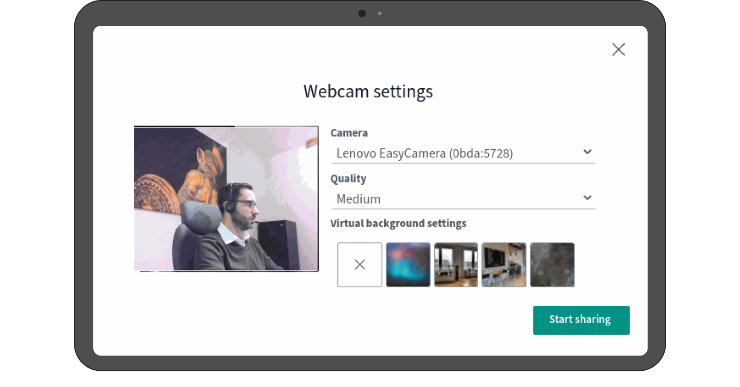 Just easily pick your favourite background for each upcoming online-meeting or web-conference, choose the quality of transmission and select the webcam to be used.
